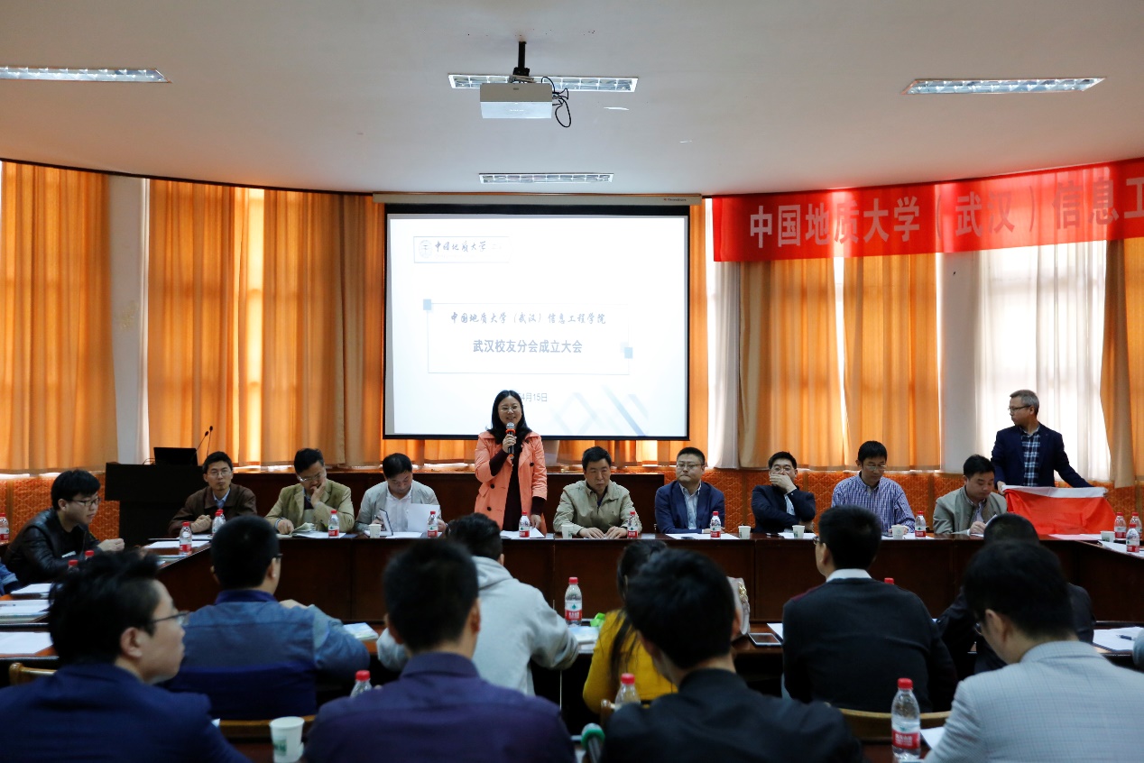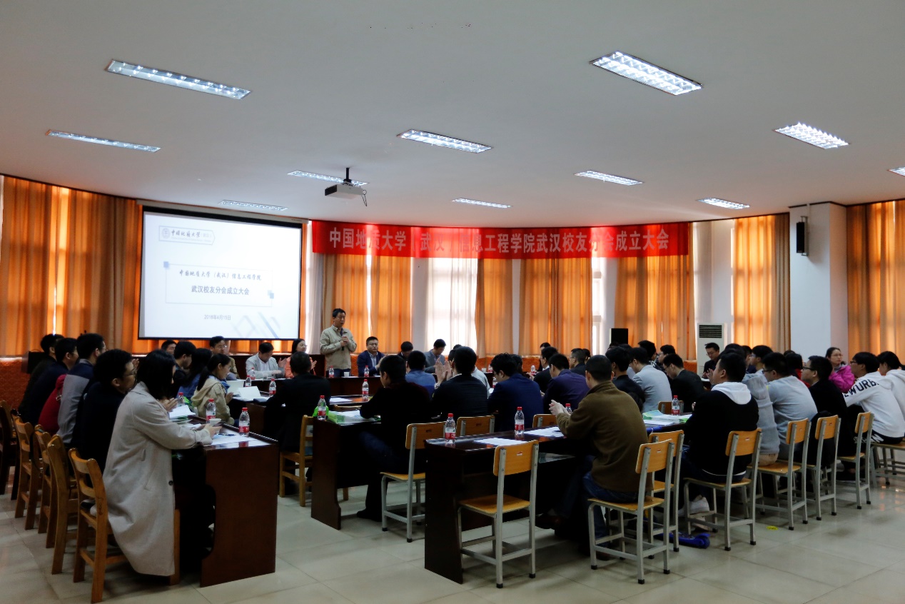 (武汉)校友与社会合作处处长徐岩,信息工程学院党委书记黄菊、信息工程学院院长谢忠、副院长刘修国、潘雄、软件工程系主任尚建嘎、地理信息科学系主任胡楚丽、遥感科学与技术系刘福江、学院办公室主任逄礴、学工组全体老师及武汉校友50余人出席成立大会。大会由信息工程学院党委副书记许德华主持。