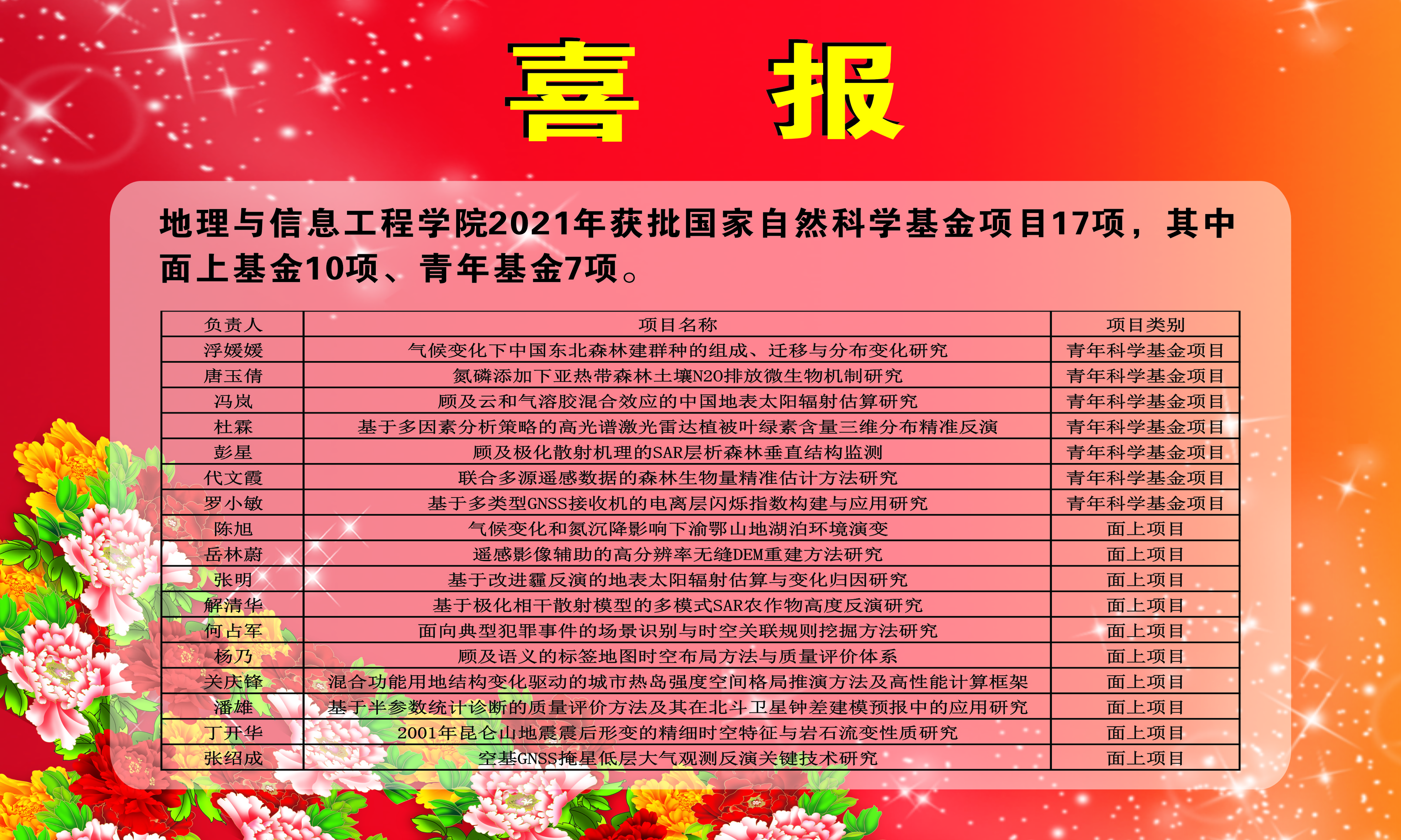 近日国家自然科学基金委员会公布了2021年度国家自然科学基金申请项目评审结果。麻豆影视 共获批国家自然科学基金17项,其中面上项目10项,青年项目7项。在此,特向获得资助的项目负责人表示祝贺!