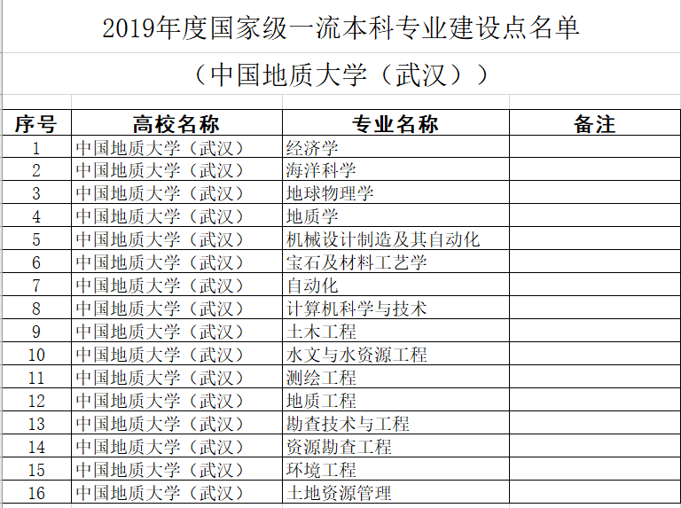 入选国家级一流本科专业建设点的专业是:地质学、资源勘查工程、水文与水资源工程、环境工程、土木工程、地质工程、地球物理学、勘查技术与工程、机械设计制造及其自动化、经济学、测绘工程、宝石及材料工艺学、土地资源管理、计算机科学与技术、自动化、海洋科学;入选省级一流本科专业建设点的专业是工商管理、地理信息科学。