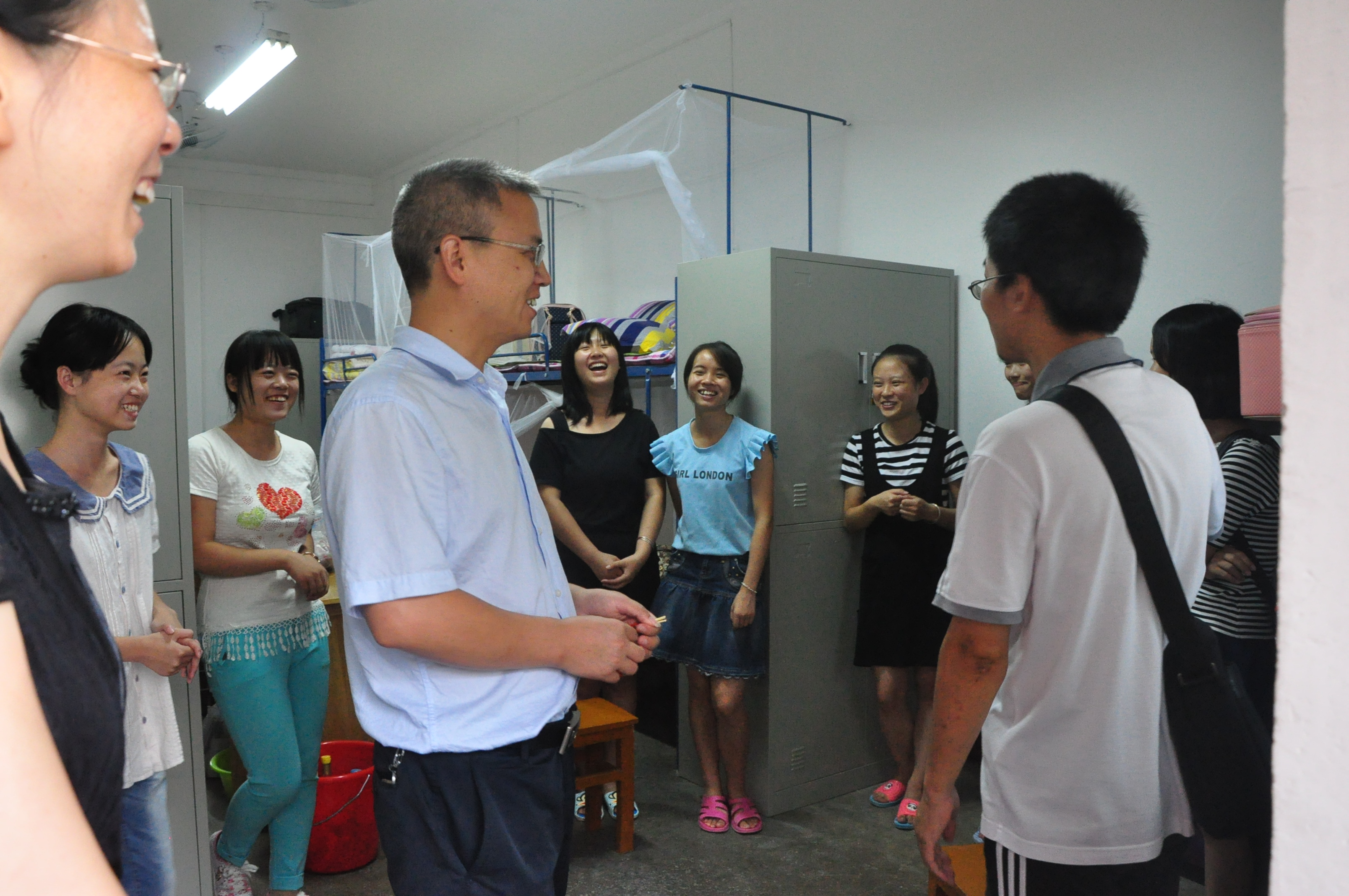 9月9日下午四点,为了解新生入住情况,信工学院院党委书记黄菊,副院长胡友健、刘修国,副书记许德华和2015级各班班主任一同走访所有的新生宿舍。