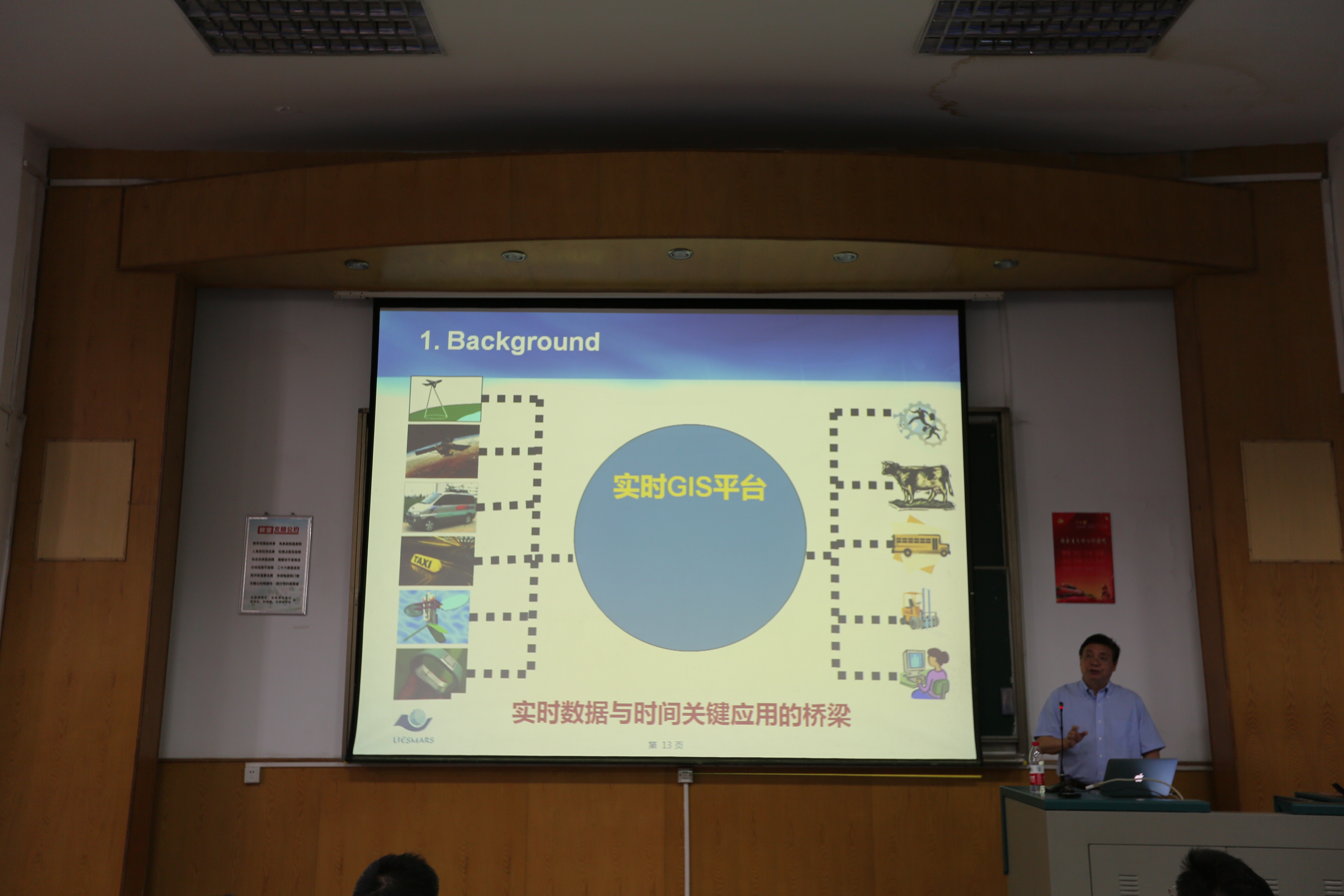 学生做题为“实时地理信息系统与应用”的学术报告。信息工程学院院长谢忠、副院长刘修国、党委副书记许德华和学院师生共同聆听了此次报告。