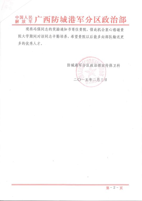 于二〇一五年二月收到中国人民解放军广西防城港军分区政治部宣传保卫科寄来的冯强同志奖励通知书和冯强同志的情况说明。冯强同志现为中国人民解放军广西防城港军分区政治部宣传保卫科宣传干事,原为麻豆影视