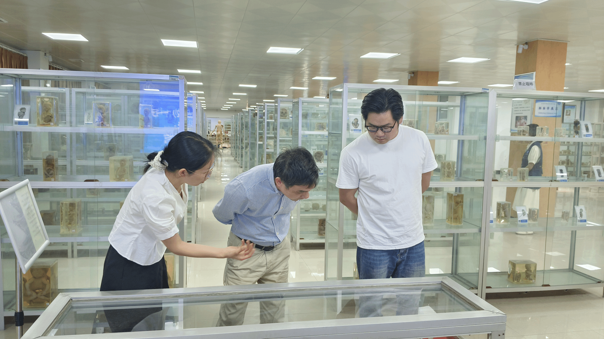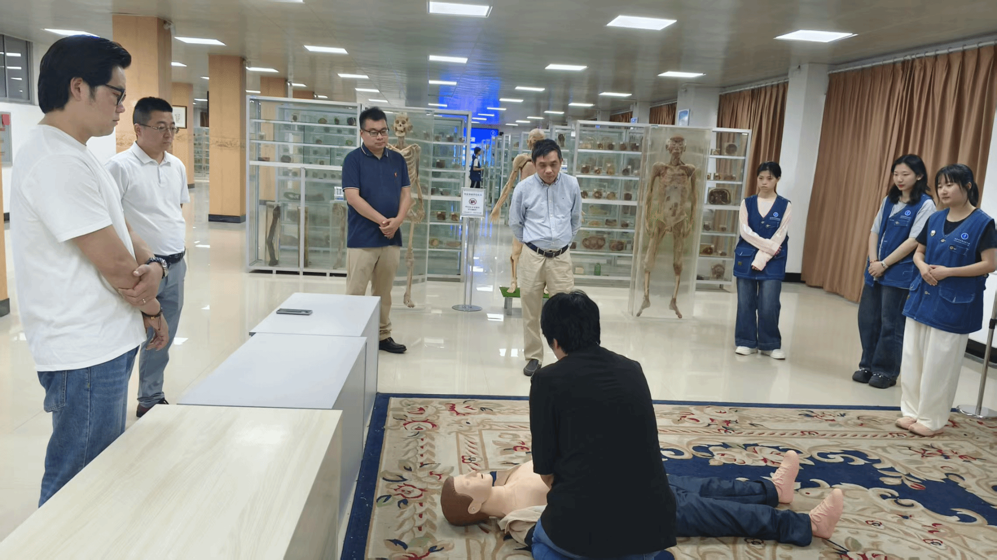 在湖北科技学院生命科学标本陈列馆,廖文莉老师等带领大家参观了各个展区,并详细介绍了标本馆与思政教学中心的协同育人机制,最后还亲自为老师们示范了心肺复苏方法。该馆藏有上千件师生自制人体标本,涵盖了多个门类,有胚胎标本区、病理标本区、解剖标本区,特别是1974年出土的员外夫人女尸是该馆的整馆之宝,皮肤完整,牙齿尚存,头戴金簪,周边还有灯芯草、木炭。在这里,每一次驻足、每一次凝视,都是对生命奥秘的一次深刻领悟,琳琅满目的珍稀生命标本静静诉说着生命的多样与复杂,每一份展示都是大自然与人类智慧交相辉映的杰作,也是对人类智慧与自然和谐共生理念的生动诠释。