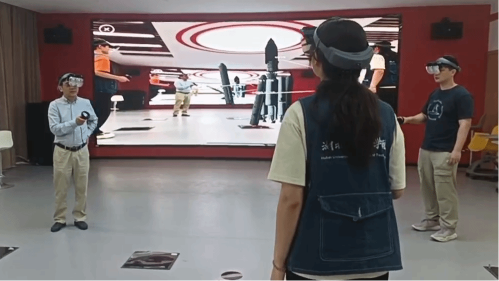 在课程思政虚拟仿真中心,郑贵洲教授和周琪主任亲身体验了中心的混合现实(MR)教学环境。利用头戴式显示设备与实体场景结合,实现了虚拟与现实场景的无缝切换,获得沉浸式、交互式的学习体验,有效提升了思政理论的现场感与代入感。智慧课程思政中心这种采用虚拟现实技术的方式,集管理、教学、实训、评测为一体,为课程思政教学提供坚实保障。