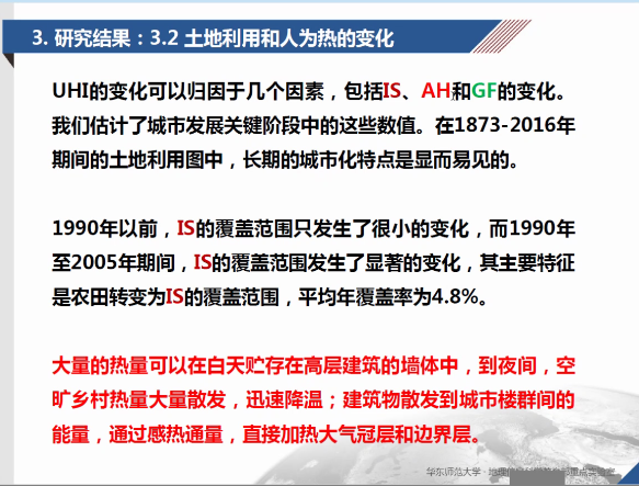 束炯教授介绍了团队对近144年来上海城市气候与土地利用变化研究,通过数学模拟和模型分析,证明城市热岛效应会因为大规模城市更新而降低,为我国以及世界其他城市的旧城改造以及更新提供了新思路。束炯教授提出,城市中的不透水面与植被覆盖率是影响城乡热量差异的主要因素。在上海城市更新的过程中,屋顶绿化以及在建筑物间隙中进行小斑块的绿化种植,都对降低城市热岛效应起到了积极作用。讲座最后,束炯教授指出,减少城市热岛效应虽不能显著减缓全球气候变暖,但也是应对气候变暖措施的一个重要部分,各领域做出小贡献聚合起来实现节能减排的大目标,进而取得有效益、有质量、可持续的城市发展实绩。