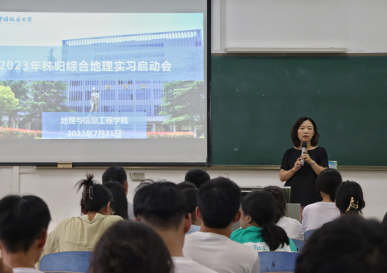 (武汉)秭归产学研基地并召开实习启动会,拉开了为期四周的2023年秭归综合地理实习帷幕。会议由实习队长侯林春主持,学院党委书记孙莉、副院长宋小青、带队教师孙嘉、辅导员陈涛,基地副站长李桢以及实习队全体同学参加会议。