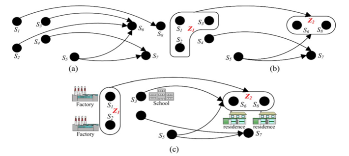 随着车载GPS的快速发展,车辆及乘车者的移动记录变得更加容易获取。本研究将地域和地域间移动模式相融合,提出一种通过出租车轨迹数据发掘地域及其移动模式的方法,通过空间和属性特征的双重约束,保证地域间的无重复性,使发掘的移动模式关联的地域的功能更集中,如图1所示。