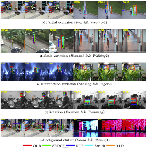 本研究与现有的跟踪算法在不同场景下的定性比较结果如图4所示。PSRDCF在目标遮挡、尺度变化、光线变化、旋转、背景嘈杂等场景下均能保持良好的跟踪效果。