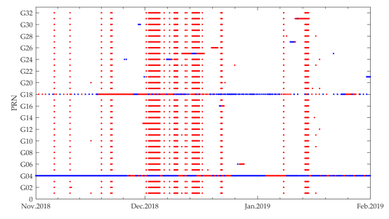 图1 2018年11月-2019年1月MADOCA实时产品中GPS卫星的可用情况,红点为MADOCA产品不可用历元,蓝点为MADOCA和IGS最终星历均不可用的历元