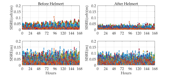 图2 2018年11月11-17日经Helmert转换前后的MADOCA实时产品中所有GPS卫星的SISRE(orb)和SISRE值时间序列统计