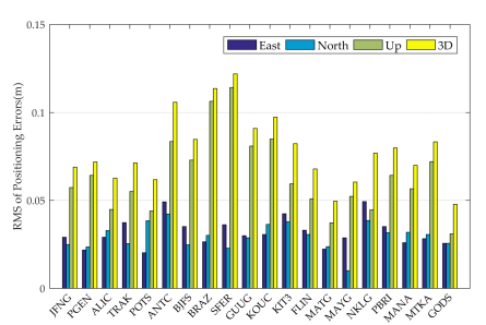最后,论文随机在全球范围内选取了20个测站并利用RTKLIB软件进行了仿实时动态PPP试验验证,统计了其定位误差的RMS值(图4)。结果表明:定位精度在东、北方向上优于10cm,、天顶方向优于15cm,可以满足信号覆盖范围内RTPPP用户对卫星轨道和钟差的高精度需求。