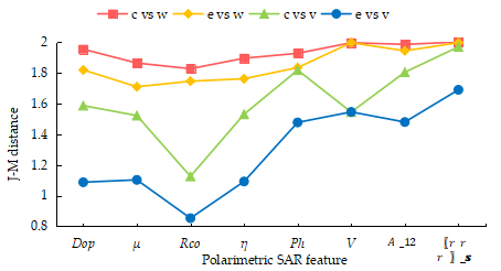 )进行对比分析,分析其在矿物油膜(c)、混合油膜(e)、类油膜(v)以及海水(w)中的区分能力。从图2中可以看出,自相似性参数的两种油膜与类油膜的区分力要强于其他极化特征。