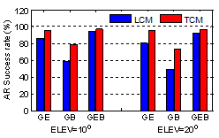 图3. 10o与20o截止高度角时,松组合与紧组合RTK的模糊度固定成功率(a: 单频;b:双频)。GE代表GPS/Galileo,GB代表GPS/BDS-3,GBE代表GPS/BDS-3/ Galileo;模糊度固定时Ratio阈值为3.0