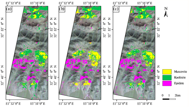 受限于野外采样的困难,通常情况下只用少数矿区内的野外样品信息评估整个分类结果,而无法采用混淆矩阵对分类结果进行定量评价。本文采用最小噪声分离、纯净像元指数、n维可视化、匹配滤波算法构建了机器学习所需的训练集与测试集。投票极限学习机算法2012年由南洋理工大学黄广斌团队提出,该算法将投票机制与极限学习机算法结合,本次研究首次将投票极限学习机算法用于热液蚀变矿物填图。采用随机森林、投票极限学习机和核极限学习机处理Hyperion 短波红外数据,三种算法取得的分类精度分别为95.52%,97.31%和96.48% (图2)。