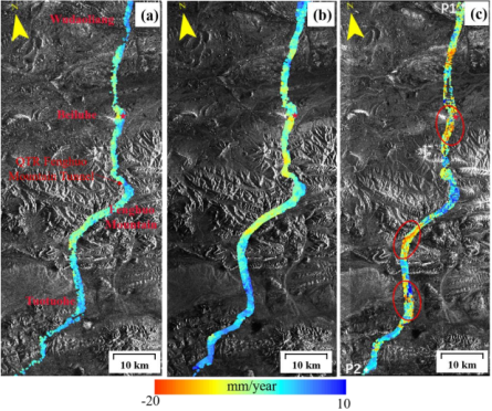 图2 估计的青藏铁路沿线走廊的年沉降速率(a)ERS-1 1997-1999, (b) ENVISAT 2004-2010, (c) Sentinel-1A 2015-2018
