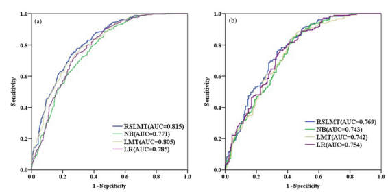 图2:各模型的ROC曲线 (a)训练数据 (b)测试数据