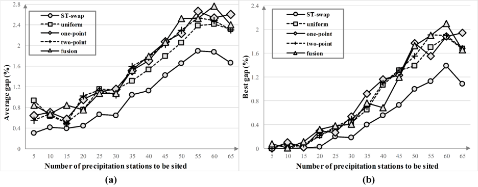以金沙江下游流域雨量站网布局为例,对所提出的改进遗传算法进行了验证。实验结果表明,与商业数学规划软件CPLEX相比,ST-swap GA能够显著降低计算的时间开销,大幅提高求解效率。同时,GA结果与CPLEX结果的偏差度(Gap)表明ST-swap GA的性能优于传统遗传算法。从与采用传统交叉算子(单点交叉、均匀交叉、融合交叉)的遗传算法在不同待布设的雨量站总数量p下输出的最优解的对比图中(图2)可以看出,ST-swap GA最优解的误差值小于使用传统交叉算子的遗传算法。因此,本文所提出的改进遗传算法能够快速准确地求解时间加权的星地时空最大覆盖问题。