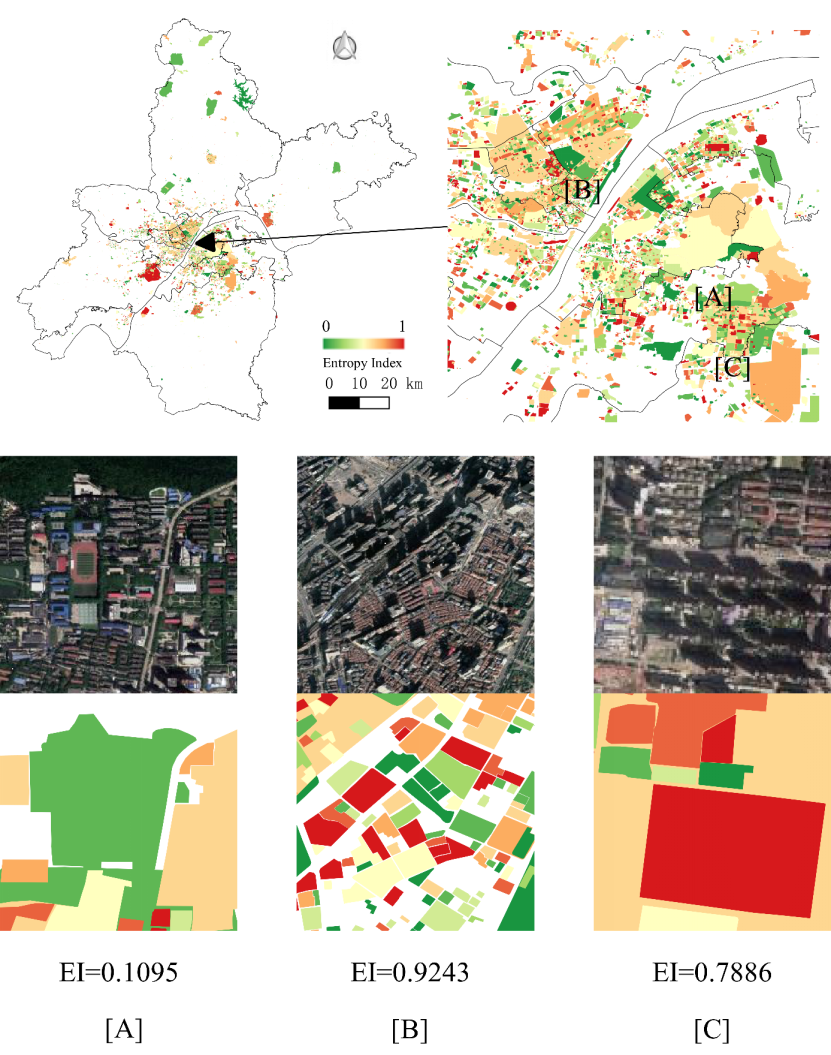 【图2 武汉市地块尺度的职住属性混合熵分布结果:(A)麻豆影视