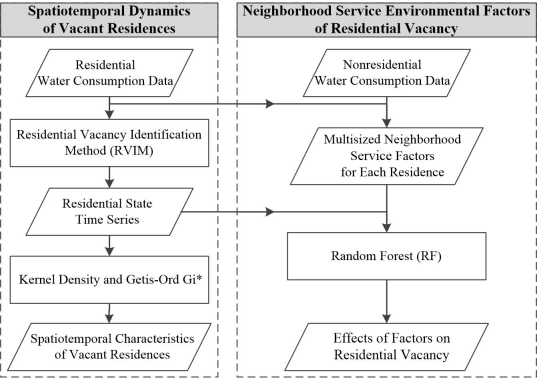 研究背景:近数十年中国城市化空前发展,城市空置住宅急剧增加。无数且具危害性的空置住宅已受到批判。学者们尝试采用夜光影像、基于位置的服务数据自下而上洞察城市空置住宅。由于数据局限性,两个问题仍未得到充分研究:难以描述精细尺度的空置住宅时空动态;罕见剖析住宅空置影响因素。鉴于此,引入市政水耗,本研究提出可行且通用的住宅空置分析框架,旨在详细描绘城市中空置住宅并且解释缓解住宅空置的规划政策。