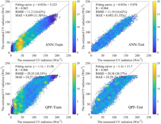 图2. 太阳紫外辐射量估算精度验证图 (ANN指本研究改进的紫外辐射云透过率估算方法,QPF指二次多项式;Train和test分别指训练阶段和测试阶段)