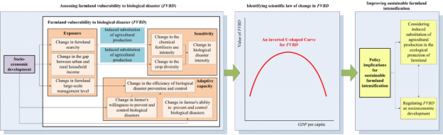 农地可持续集约化是协调食物安全、社会经济发展和生态文明的必然选择。但是,因生物灾害所致的农地退化对农地可持续性集约化构成了重大挑战。有关农地利用生物灾害脆弱性的研究还十分少见。本研究尝试基于诱致性生产替代理论构建农地利用生物灾害脆弱性的理论框架、评估方法,在我国农地最为稀缺的15个省(直辖市、自治区)论证农地利用生物灾害脆弱性倒U型曲线规律,并提出农地可持续集约化的政策建议。