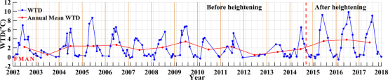 长时序温度反演结果表明,丹江口大坝对下游河流水温影响存在显著的季节性周期和年际间变化。夏季水温差异最为显著,冬季最为微弱,春、秋两季则存在中等程度的差异。大坝对下游水温影响的年际间变化亦十分显著。在大坝加高之前(2002-2014)夏季水温差异总体在6°C上下波动,而在大坝加高后(2015-2017)水温差异则提高至约10°C;年平均水温差异也由加高前的2°C左右提高加高后的至4°C左右(图3)。