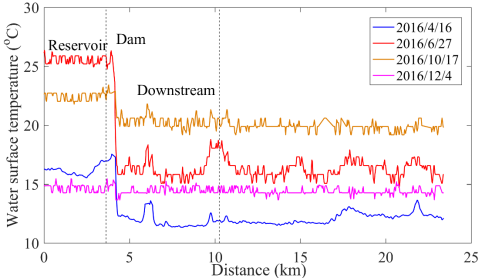 水表温度反演结果表明,丹江口大坝运行对下游汉江水温产生了季节性的影响:春季下游河道水温明显低于水库温度;夏天这种水温差异达到峰值;秋季水温差异减小,虽然依旧显著;冬季水温差异基本消失(图1)。
