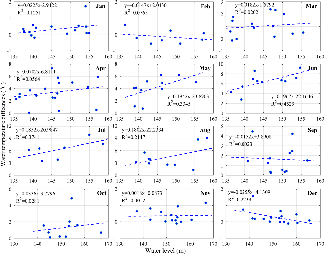 大坝对下游河流的热影响与水库水位密切相关。水位提高会减弱表层与深层水体之间的热量交换,导致水温垂直分层现象加剧,这是大坝加高后水温差异升高的原因之一。图5展示了各月水温差异与水位的关系。两者在水温分层现象显著的5-8月呈现正相关性;而在水温分层现象微弱甚至不存在的其他月份中,点位分布离散,两者的相关性较低,表明水位的影响并不明显。