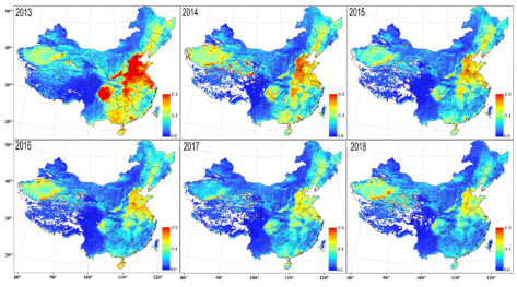 图1 2013 - 2018年中国MODIS DB AOD年平均值