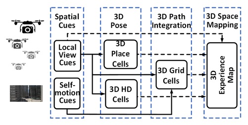 该项目NeuroSLAM通过借鉴大脑三维导航神经机制,为机器人开发了一套全新的类脑三维定位与制图系统。以低成本的相机作为主要传感器,以连续的图像流作为主要输入来计算局部环境线索和三维运动信息。在此基础上,基于多维连续吸引子神经网络,利用3D 位置细胞(3D Place Cell)、3D方向细胞(3D Head Direction Cell)模型来表达机器人在三维空间的位姿,通过3D 网格细胞(3D Grid Cell)模型实现机器人在三维流型空间的3D路径积分(3D Path Integration),并基于Local View Cell、 3D Place Cell、3D Head Direction Cell来编码机器人的三维空间经验,实现了机器人在三维环境下的同步定位与制图。