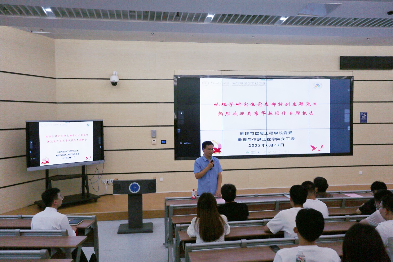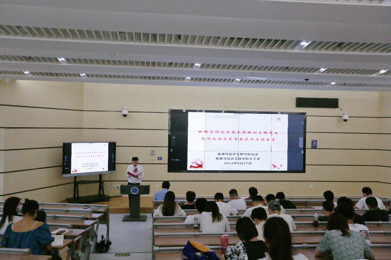 武彦斌介绍了本次主讲嘉宾吴东华教授,并对地理学研究生党支部在成立后如何建设、发展做出安排,强调如何引导支部党员和入党积极分子在思想上树立坚定的马克思主义信仰是支部建设的重要内容,鼓励大家认真听讲、做好笔记、积极交流。