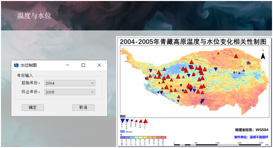 大赛从2020年1月份启动,10月底举行决赛,这9个月的时间里,卢一鹏小组的同学们精心打磨出了一份优秀的作品《多源遥感数据青藏高原湖泊综合信息提取制图平台》,本系统联合多源卫星数据研究青藏高原近30年来湖泊水储量变化,利用测高和遥感数据计算湖泊面积、水位和水储量变化,结合GRACE观测数据对湖泊水量变化进行了验证,并进行青藏高原湖泊水量变化与年均温度变化的相关分析等。系统采用组件式开发采用了C#、MatLab和Python3编程语言,依托于PIESDK的组件包,在Visual Studio 2019中进行界面设计与程序开发。