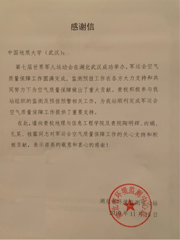 为感谢四位师生对此项工作提供的支持和所做出的积极贡献,湖北省环境监测中心站特发来感谢信对他们表示崇高的敬意和衷心的感谢。