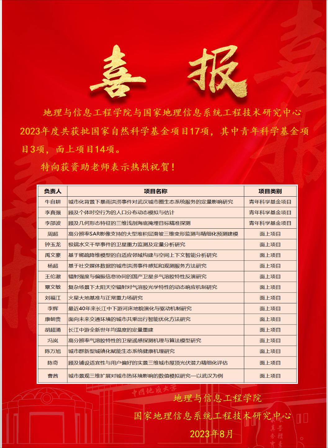 麻豆影视 与国家地理信息系统工程技术研究中心2023年度共获批17项国家自然科学基金项目