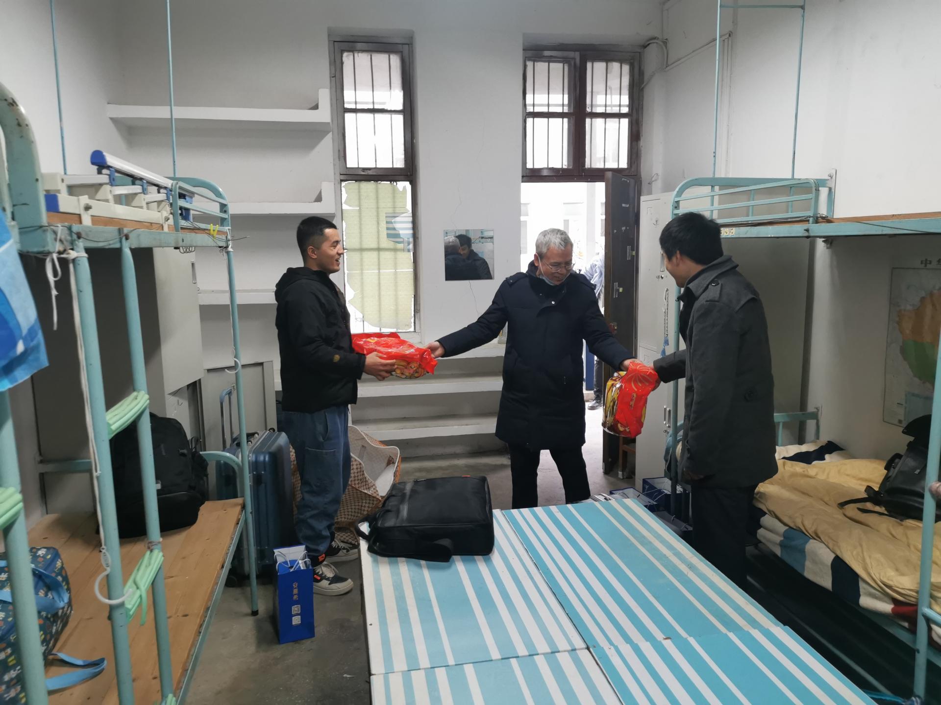 院党委书记许德华走访慰问刘九溥、赵经生、依斯马依力·努尔麦麦提、王晓荣等14名留校学生,询问了他们留校期间的学习和生活情况。他表示,同学们留校期间生活上遇到问题可及时与学校管理与服务人员,辅导员老师取得联系,大家的生活和学习环境能够得到应有的保障;他提醒同学们在留校期间,要遵守学校相关管理规定,严格做好个人防护的同时,要保持与亲友联系,与留校的同寝同学互帮互助,利用好春节假期,提升自我。最后,他代表学院向同学们送去春节慰问品,并致以新春的祝福。