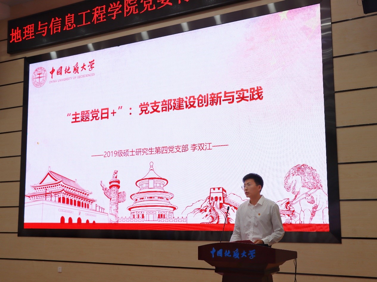 2019级硕士研究生第四党支部书记李双江以“主题党日+:党支部建设创新与实践”一题做分享,从支部思想建设,创新形式等方面做经验交流。