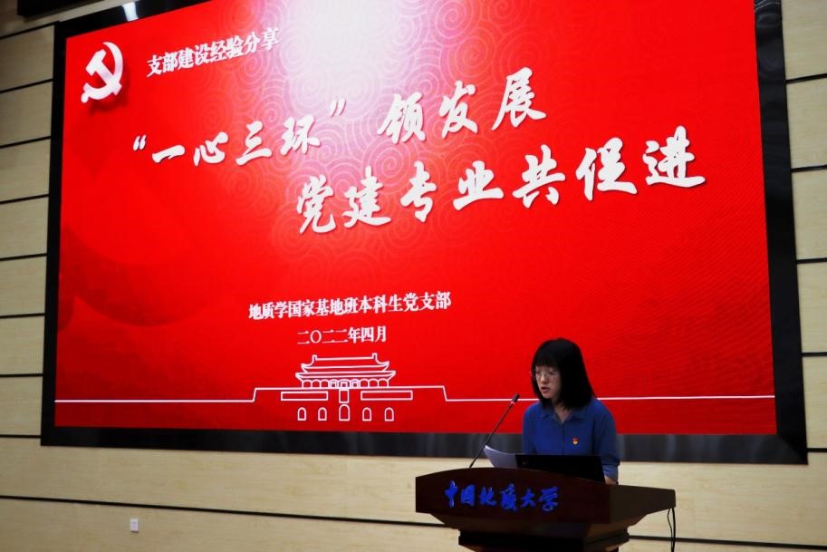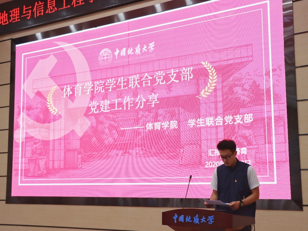 地球科学学院地质学国家基地班本科生党支部副书记胡楚玉、环境学院“张国旗班”党支部书记韩鹏、体育学院学生联合党支部书记綦霄分别以“一心三环领发展,党建专业共促进”、“永葆赤子情怀,争做时代先锋”、“体育学院学生联合党支部党建工作分享”为题作分享,介绍了各自党支部样板支部建设的情况,分享了他们的好经验、好做法。
