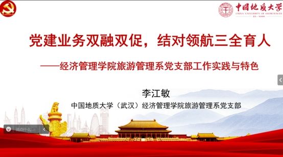会议首先邀请了首批全国高校样板党支部书记,经济与管理学院李江敏教授作经验交流。李教授以“党建业务双融双促,结队领航三全育人”为主题,介绍了经管学院旅游管理系党支部的工作实践与特色。作为全国党建工作样板党支部,旅游管理系党支部始终以党建为引领,将思政融入专业发展和教学科研中,多措并举创新学习方法形式,构建“五联五融”党建联建共同体,不断促进党建业务双融双促,取得一系列丰硕成果。
