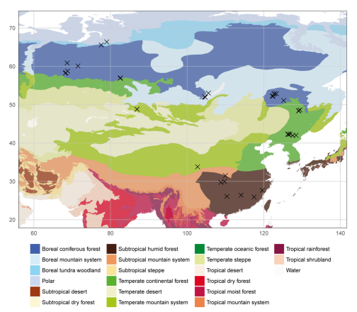 (武汉)、东北师范大学、莫斯科大学、俄罗斯科学院气候变化和生态系统西伯利亚监测站,以及约克大学等十多个科研机构。该研究历时约十余年,收集了亚洲地区东起勘察加半岛-远东地区和兴安岭-长白山区一线,西至贝加尔湖-西西伯利亚的广大地区,北起亚北极圈,南至中国南方亚高山湿地群,采集样品近3000余份,覆盖了亚洲泥炭湿地的大部分区域(图1)。